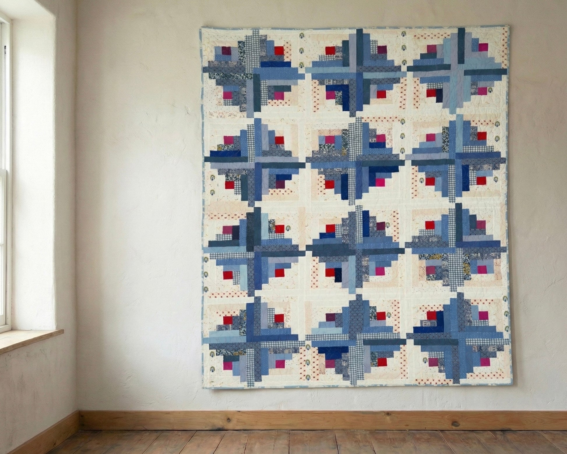 A quilt made with new and vintage cottons from one of the most traditional block-based patterns, the log cabin. Using the "sunshine and shadows" placement, design was inspired by the passing of clouds and migraines. The batting is made with fluffy and soft wool, ideal for cooler temperatures. Machine washable.