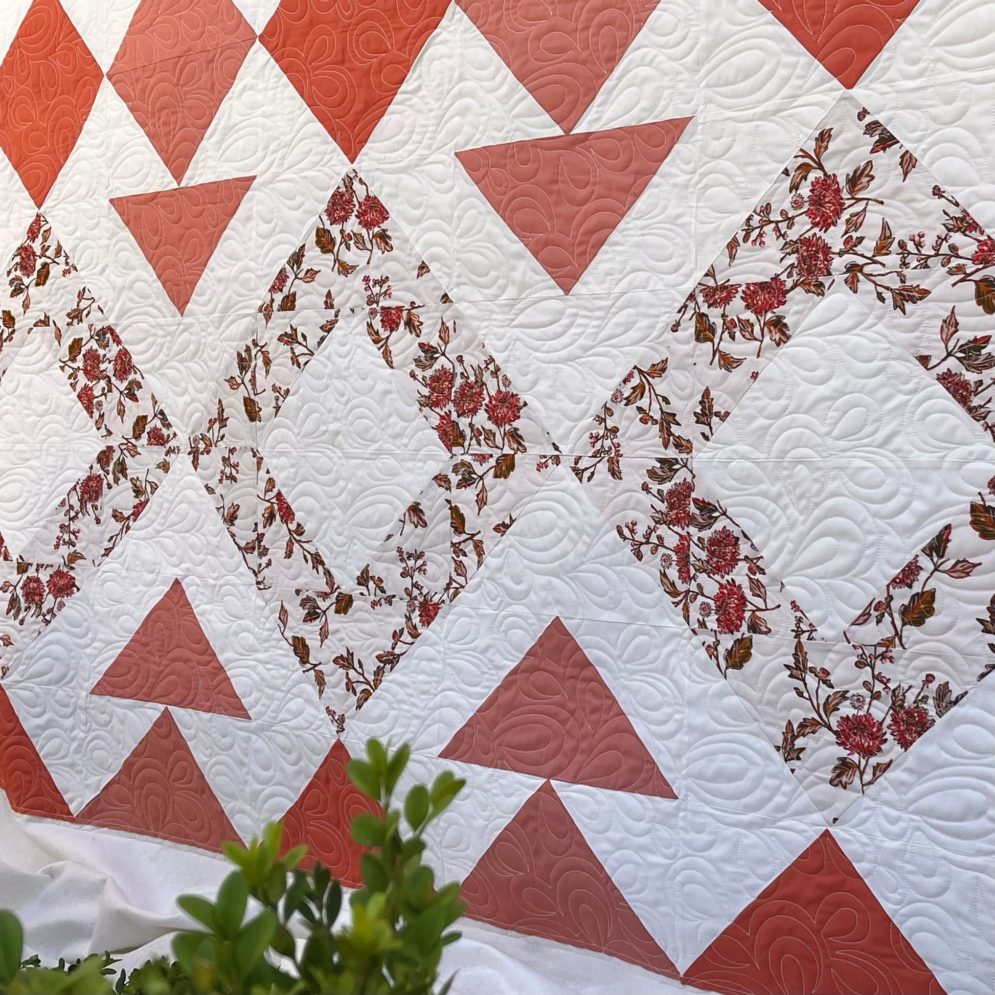 A quilt made with new cottons from one of the most traditional block-based patterns, flying geese. The design was inspired by Colorado's red rock formations, especially Red Rocks Amphitheatre. The batting is made from soft and cool bamboo, silk, botanic tencel, and cotton, ideal for summertime use. Machine washable.