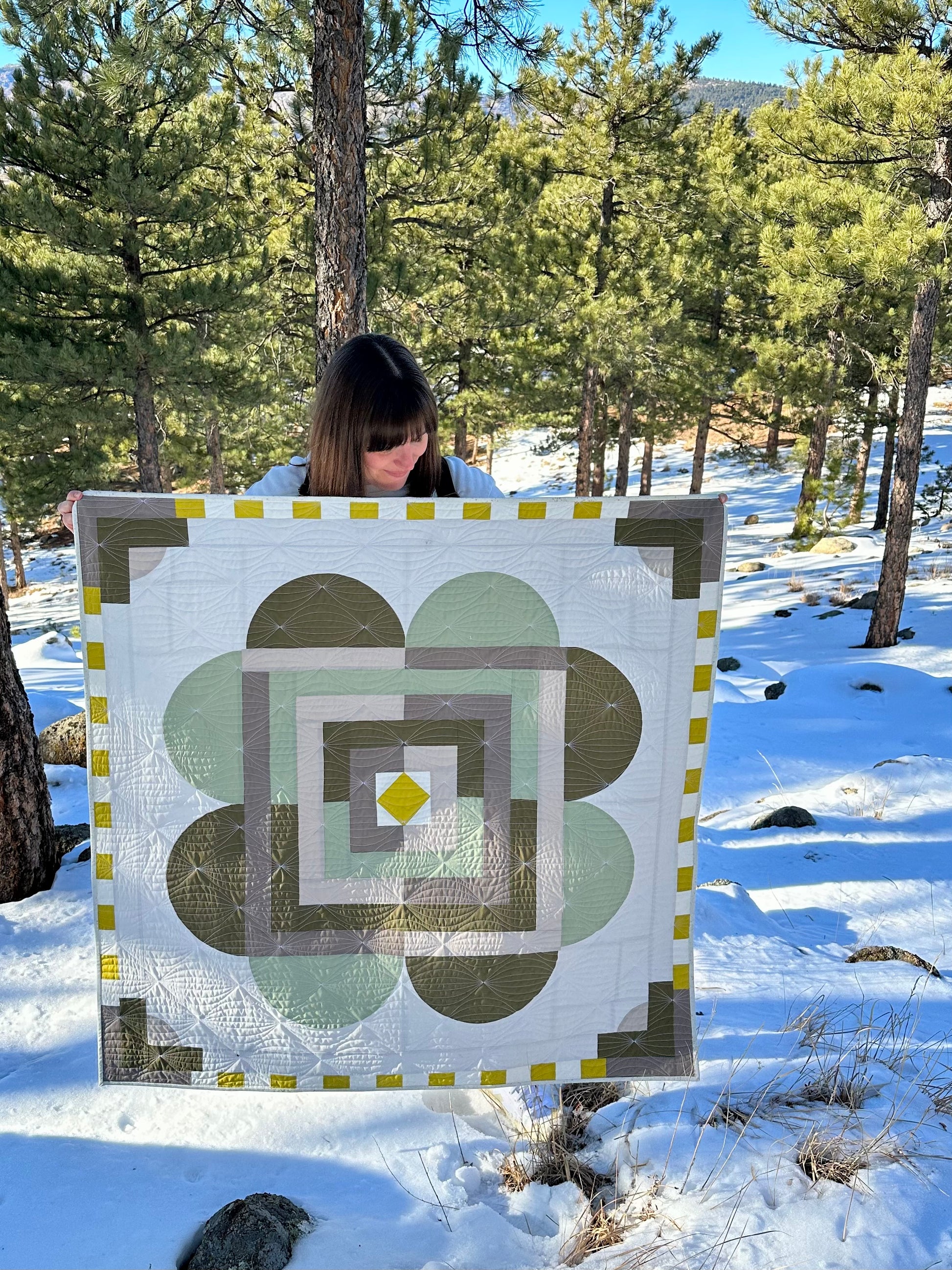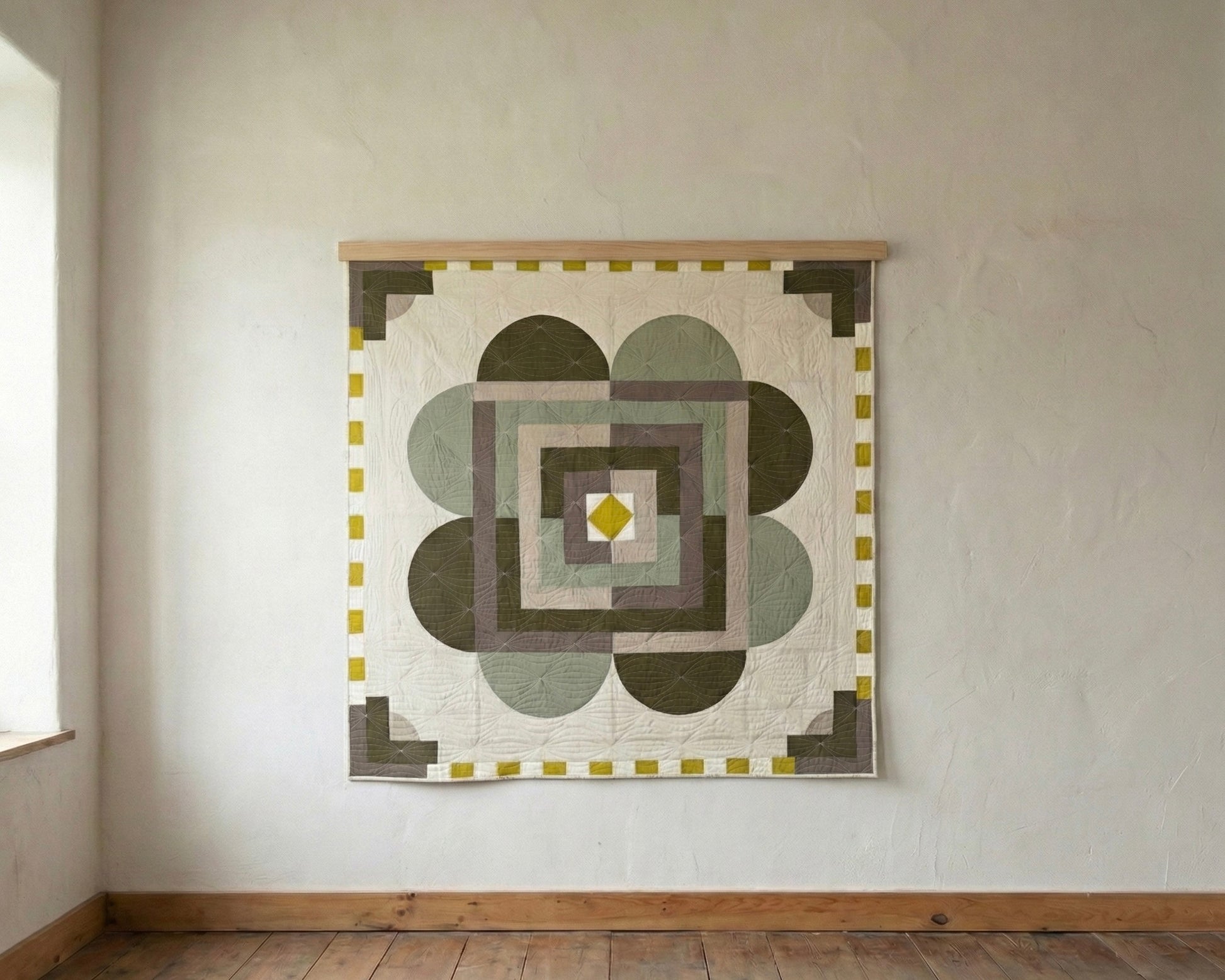 A quilt made with new cottons in a medallion with curves. The design was inspired by Colorado's beautiful green lichens. The batting is made from lightweight cotton, ideal for display as a wall hanging. Machine washable.